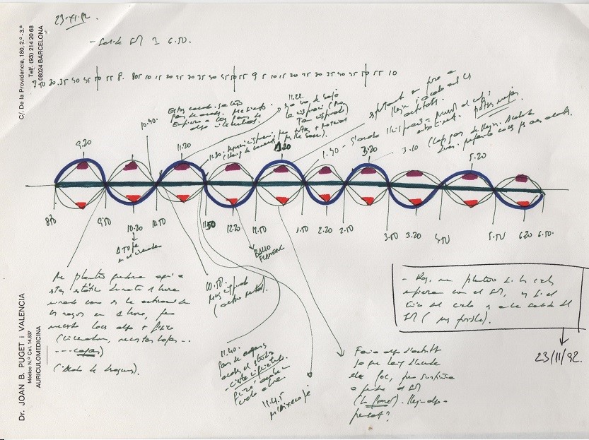 Empezamos el estudio en 1992 (hace 28 años), y desde entonces, de una forma acíclica, hemos ido realizando observaciones que se han extendido durante algunas horas del día y en las que hemos observado como variaban los diferentes estados físicos y psíquicos que se presentaban a lo largo de una jornada de observación. Al principio, los datos eran muy erráticos porque, aunque se podían observar cambios en la necesidad de realizar o no determinadas actividades, no se sabía que es lo que marcaba el inicio de los ciclos, así que era difícil poner un poco de orden y lógica en la recogida de datos, pero un día en concreto, (23/11/1992) las cosas se empezaron a organizar, con más lógica, porque apareció la hipótesis, (confirmada posteriormente) de que los ciclos biológicos empezaban su despegue con la hora de la salida del sol en el horizonte local.