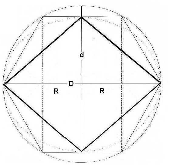 Buscaremos una relación entre ambas diagonales. Partimos de dos datos ya conocidos. Por un lado, la Diagonal Mayor, que es igual a 2R y la diagonal menor, cuyo valor determinado fue determinado antes.