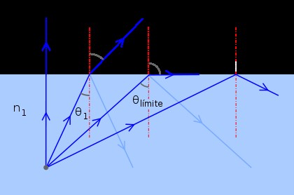 Por ejemplo, el índice de refracción del aire es n = 1,00 y el del agua, n = 1,33. Si la luz intenta pasar del agua al aire, sólo podrá hacerlo si su ángulo de incidencia es inferior al ángulo crítico. En este caso concreto, n2/n1 = 1,000/1,330 = 0,7518 con lo que θc es 48º45’.