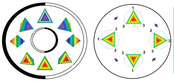 Es decir que el dibujo de la izquierda que nos habla del ciclo de polaridad Yin-Yang, gira al mismo tiempo que el ciclo de creación- retrospección. En este caso, son dos giros sincrónicos y acompasados. Pero tal como hemos comentado en alguna ocasión, y hemos realizado a nivel de programación, la figura dibujada en el ordenador permite ciclos 1:2, 1:3, etcétera.