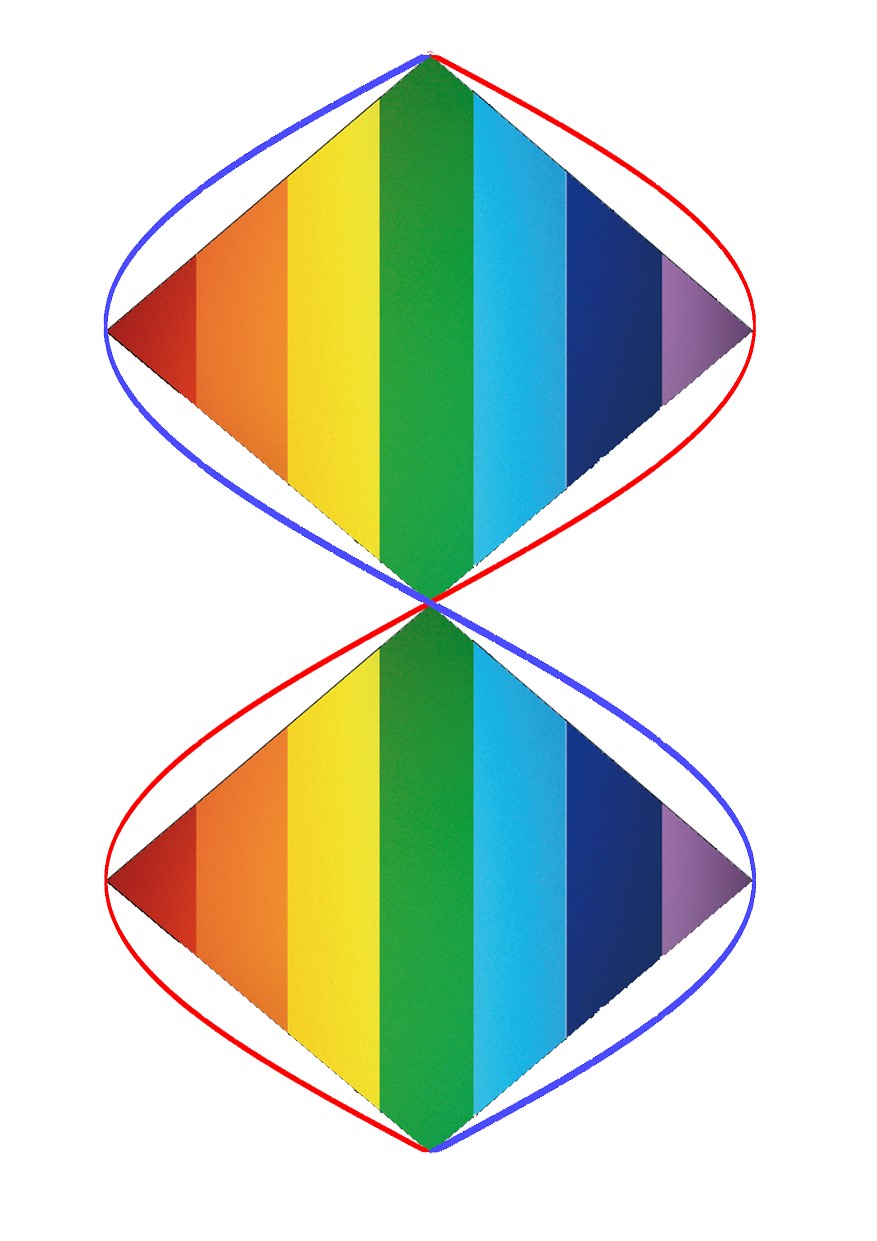 - 2. Inicio de la creación. La parte material (en rojo) empezará a girar hacia el Yin, al igual que la parte etérea (en violeta) virará hacia el Yang y al mismo tiempo, el 1 Rayo, empezará a liberarse muy lentamente desde la 7D.