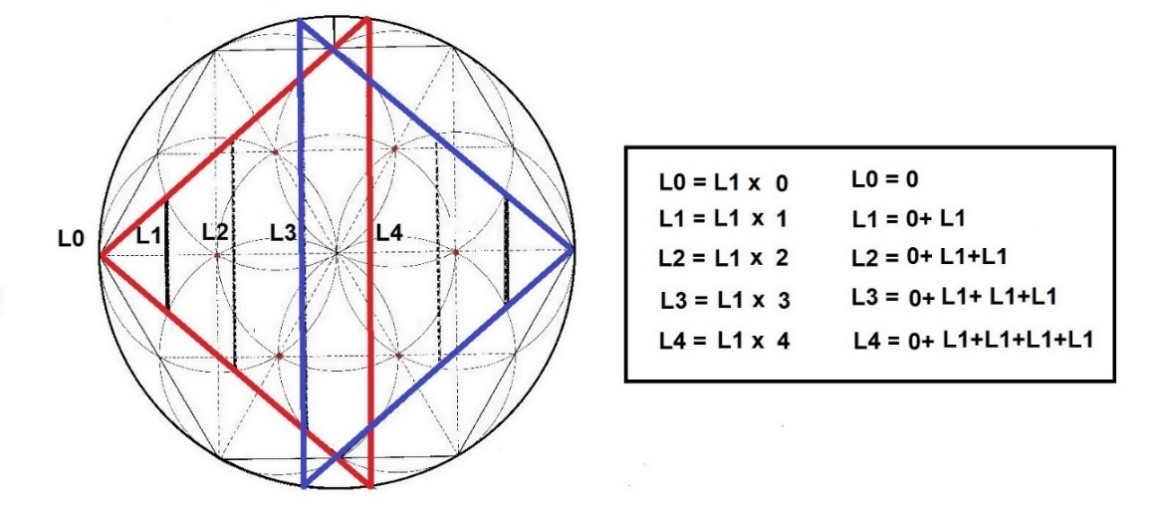 En esta figura podemos ver como el tamaño de L0 = 0, el de L1 es 5.443, el de L2 es L1x2= 10.887, el de L3 es L1x3= 16.330, y fuera ya del área del Rombo, en el siguiente número de la serie, el valor de L5 es L1x5= 27.218. Y si seguimos un poco más adelante veremos, por ejemplo, que el valor de L34 es L1x34= 185.076, el de L55 es L1x 55= 299.238 y el de L89 = L1x 89= 484.462
