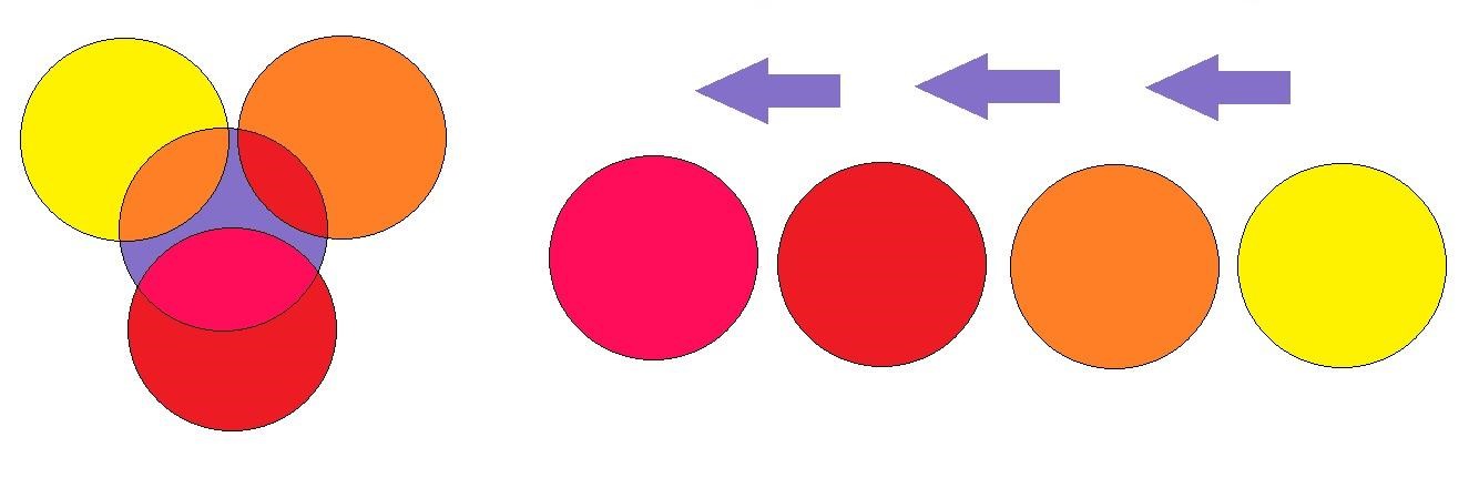 Vemos que cuando sobre el color rojo aplicamos verde, este se convierte en naranja. Si proyectamos verde sobre el color naranja, esta vira a amarillo y si proyectamos verde sobre el amarillo, se vuelve amarillo verdoso.